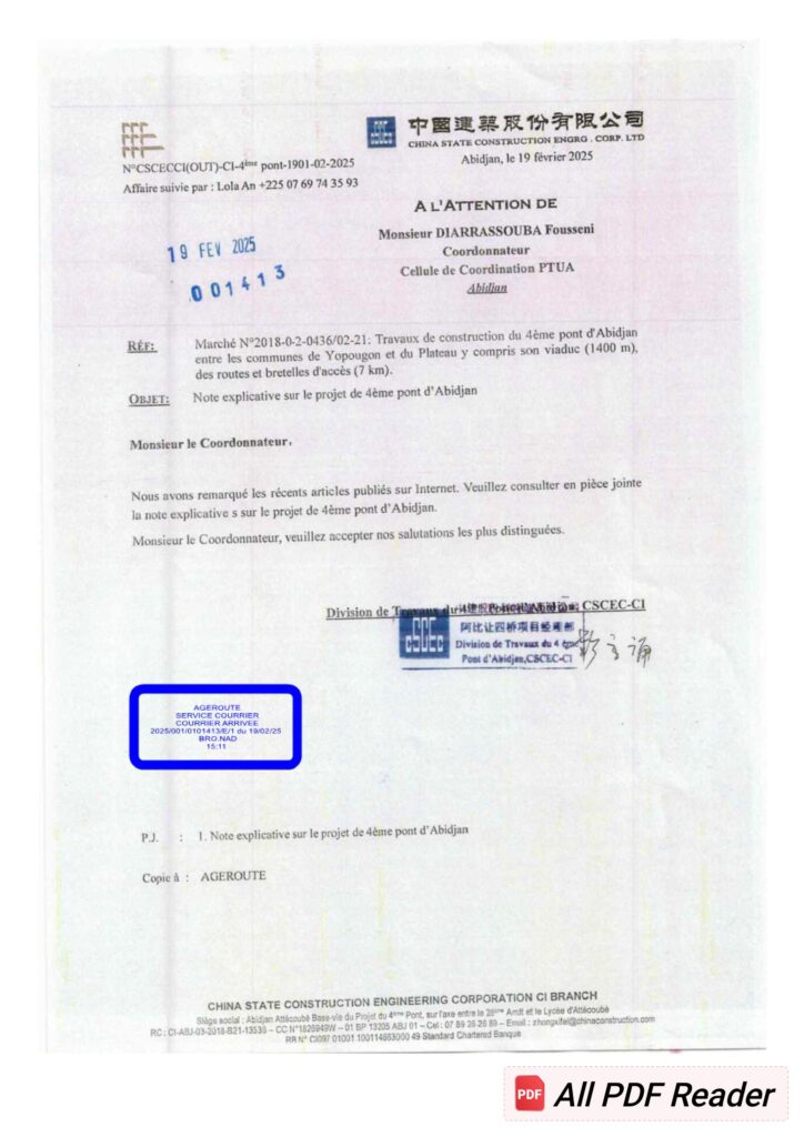 Suite à la publication d’un article diffamatoire à l’encontre de China State Construction and Engineering Corporation sur le réseau ivoirien le 10 février 2025, cet article contient des informations erronées concernant le délai d’exécution, le coût et les dépenses du projet de 4ème pont d’Abidjan en Côte d’Ivoire. Ces fausses allégations ont gravement porté atteinte à la réputation de CSCEC. Nous apportons donc les clarifications suivantes :