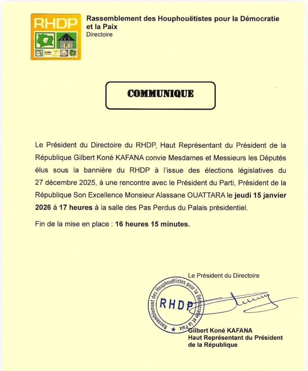 Le président de la République et président du RHDP, Alassane Ouattara, a convoqué ce jeudi 15 janvier 2026 à 17 heures l’ensemble des députés élus sous la bannière du parti au pouvoir à une rencontre au Palais présidentiel du Plateau, selon un communiqué officiel du Directoire du RHDP.